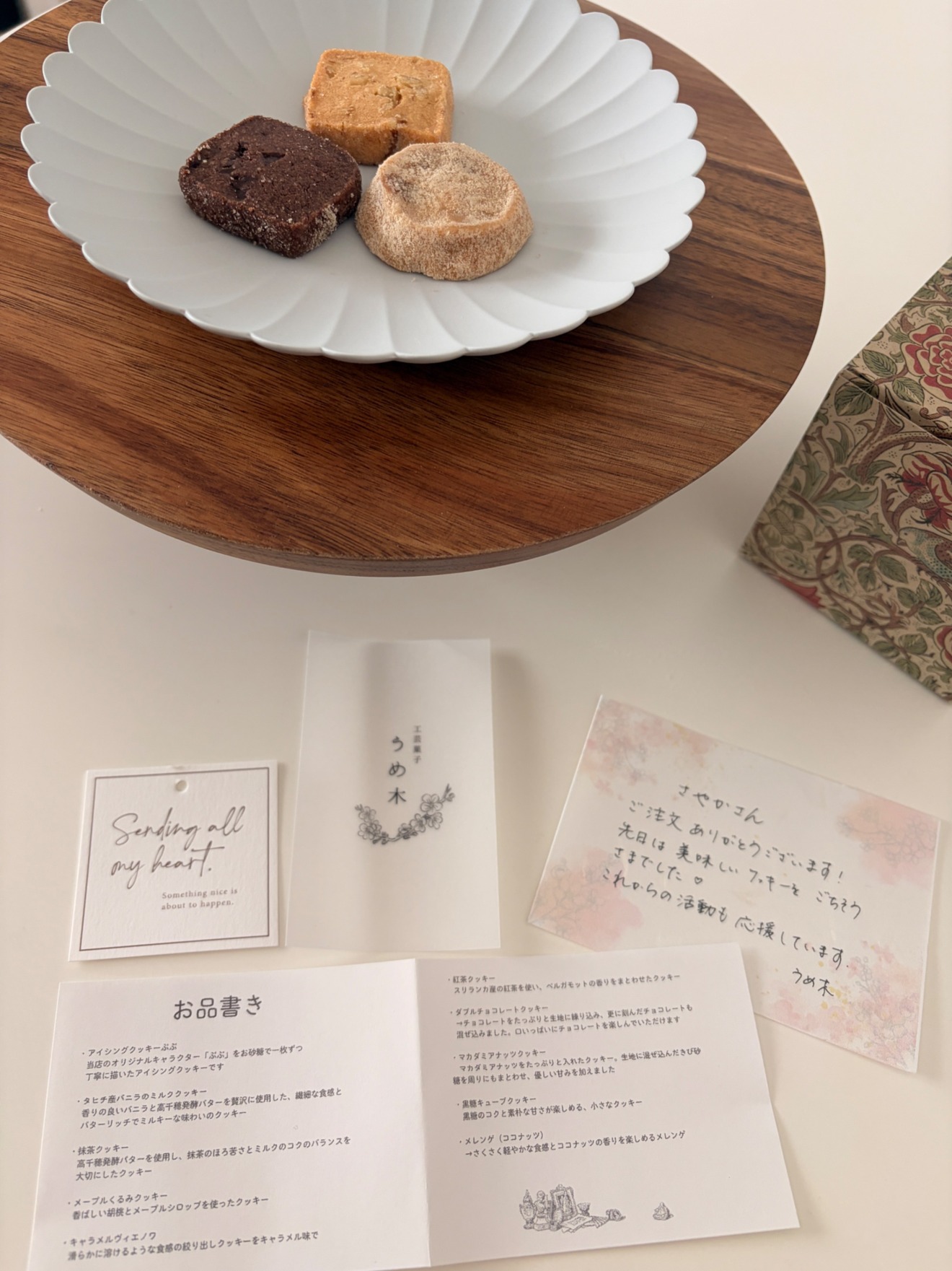 ラッピングもとっても素敵で、お品書きもショップカードも全てが丁寧で綺麗でうめ木さんのお店の雰囲気がとっても伝わりました☺️