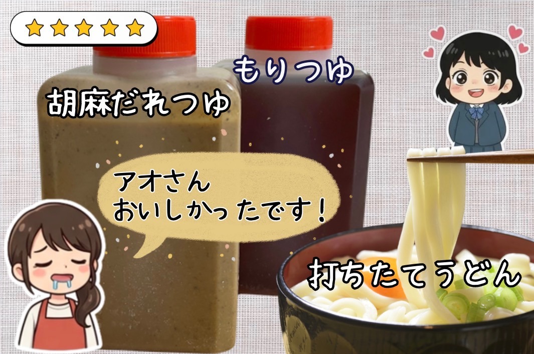 600g(3〜4人前)の生うどんに加えて、風味豊かな「もりつゆ」と、濃厚な「胡麻だれ」の2種のつけだれをセットでご用意。
