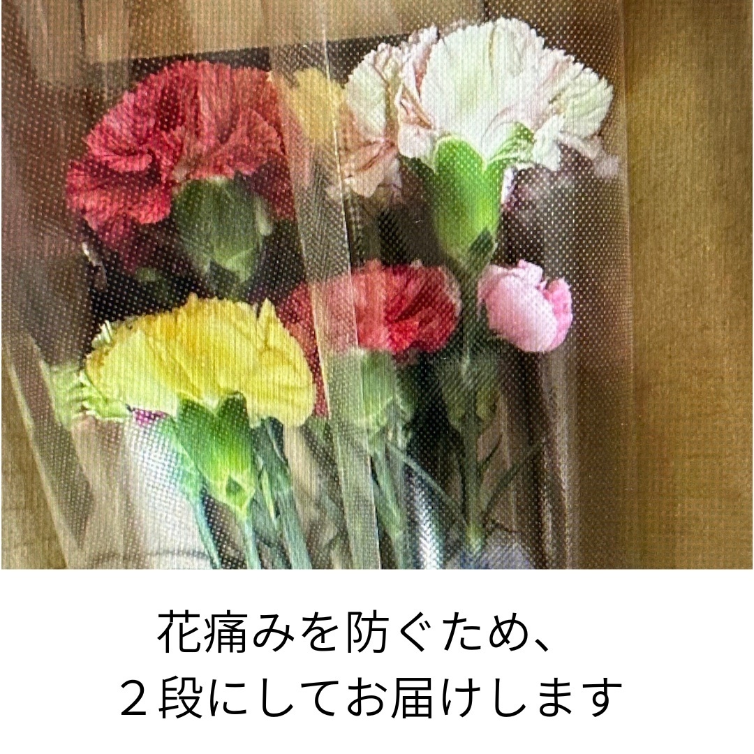 色とりどりのカーネーション20本をラッピングで包み、リボンとメッセージカード、フラワーフードのほか、お花を長く楽しめるコツをお伝えします。