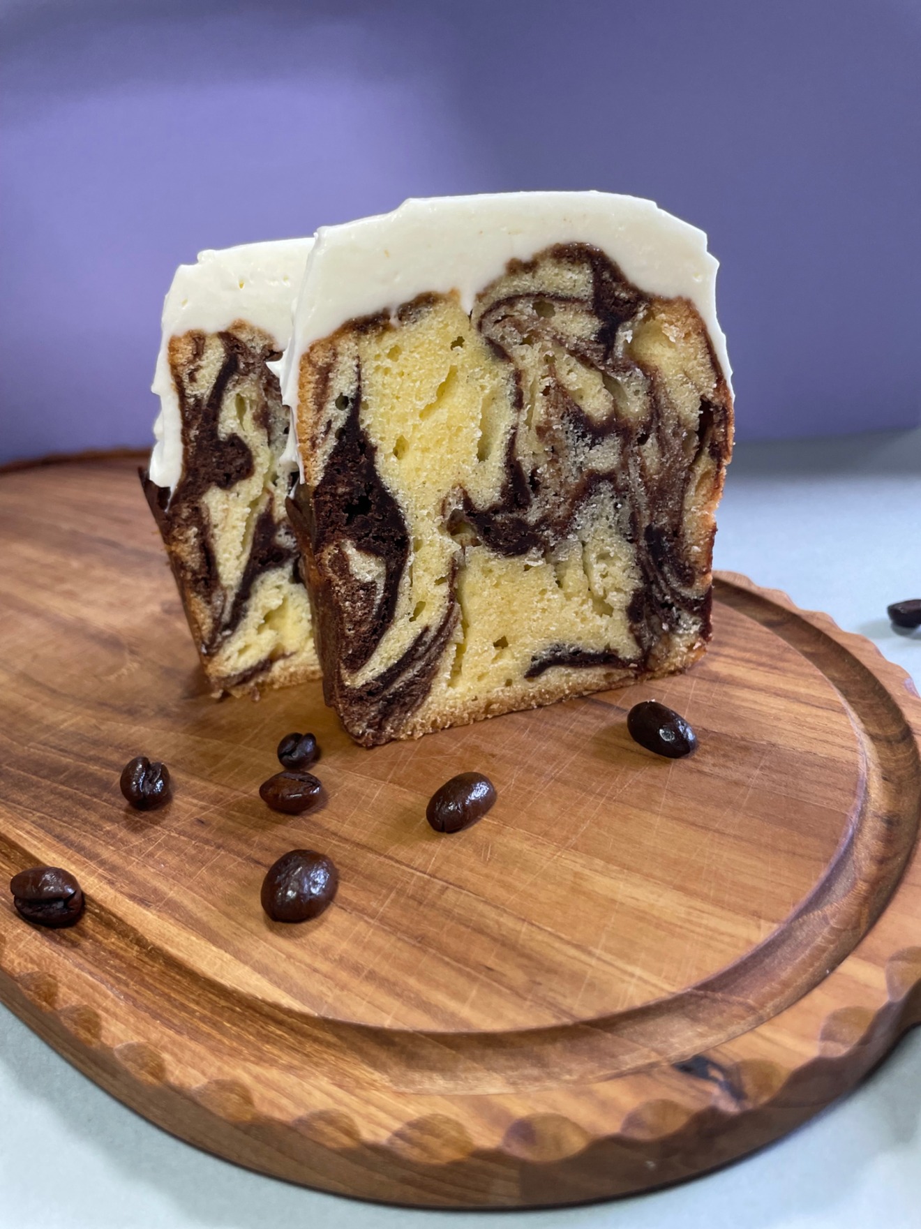 ラム酒を効かせてしっとり焼き上げたココアマーブルパウンドケーキの上にクリームチーズでおめかしした、ティラミスを食べているようなデザートパウンドケーキです★