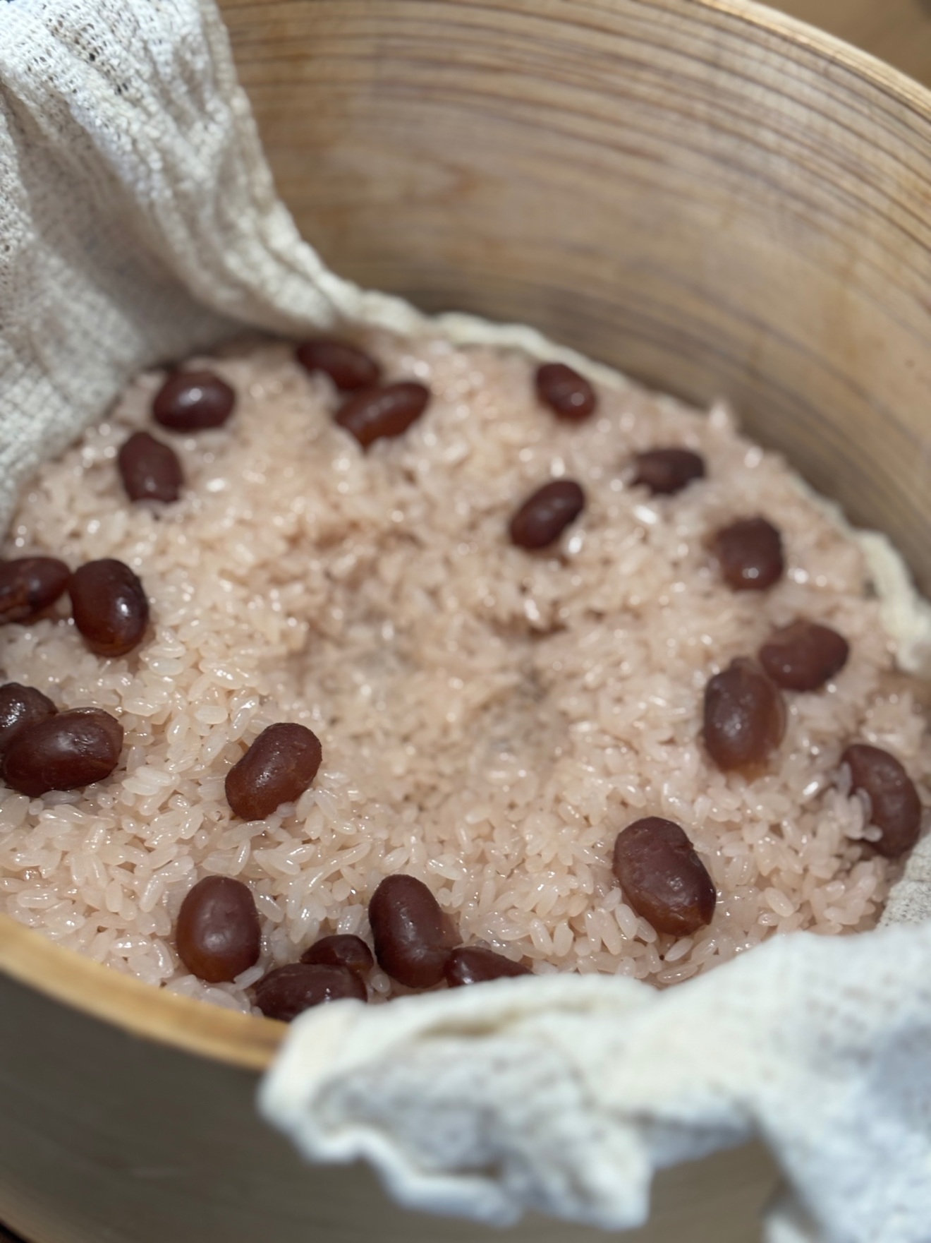 色付けに小豆を使っているのでほんのり小豆の風味も足された滋味深い自慢のお赤飯。