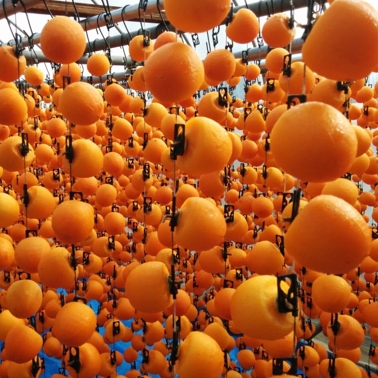 渋柿(約110g)を伝統の手法で、丁寧に寒風で乾燥させて、生産しています。その過程で、渋が抜け生柿の1/5ほどの重量の市田柿になります。