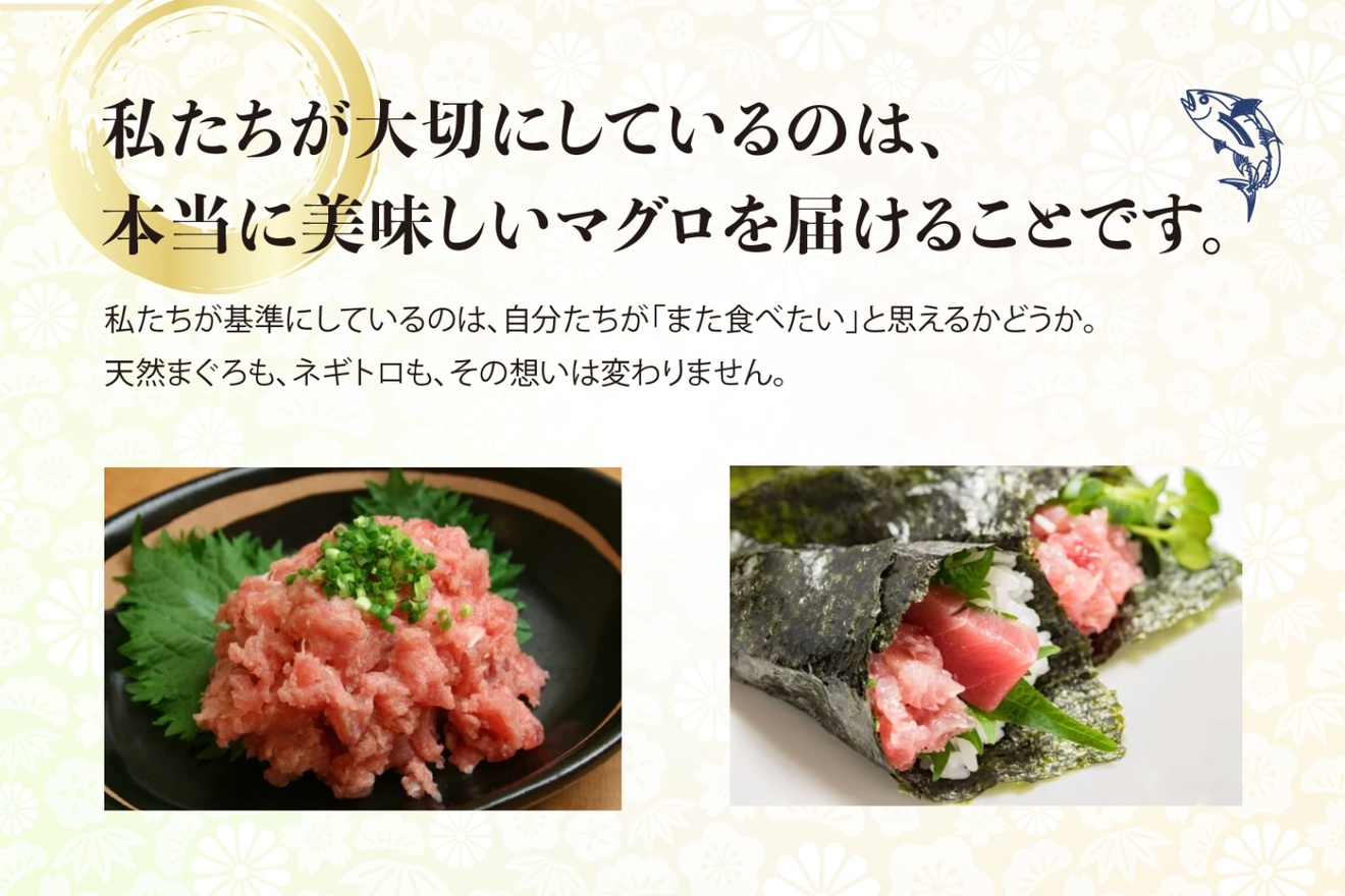 数あるネギトロの中から、「家庭で食べても本当に美味しいこと」「未冷凍でも品質が安定していること」を条件に、マグロ屋として納得できるものだけを取り扱っています。