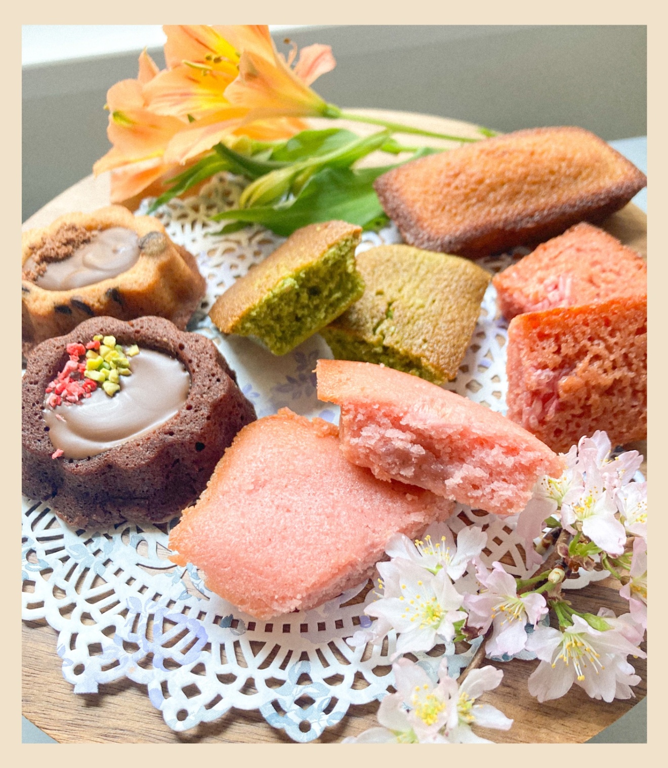 発酵バター、卵白、砂糖、アーモンドパウダー、小麦粉、チョコレート、はちみつ、抹茶、桜あん