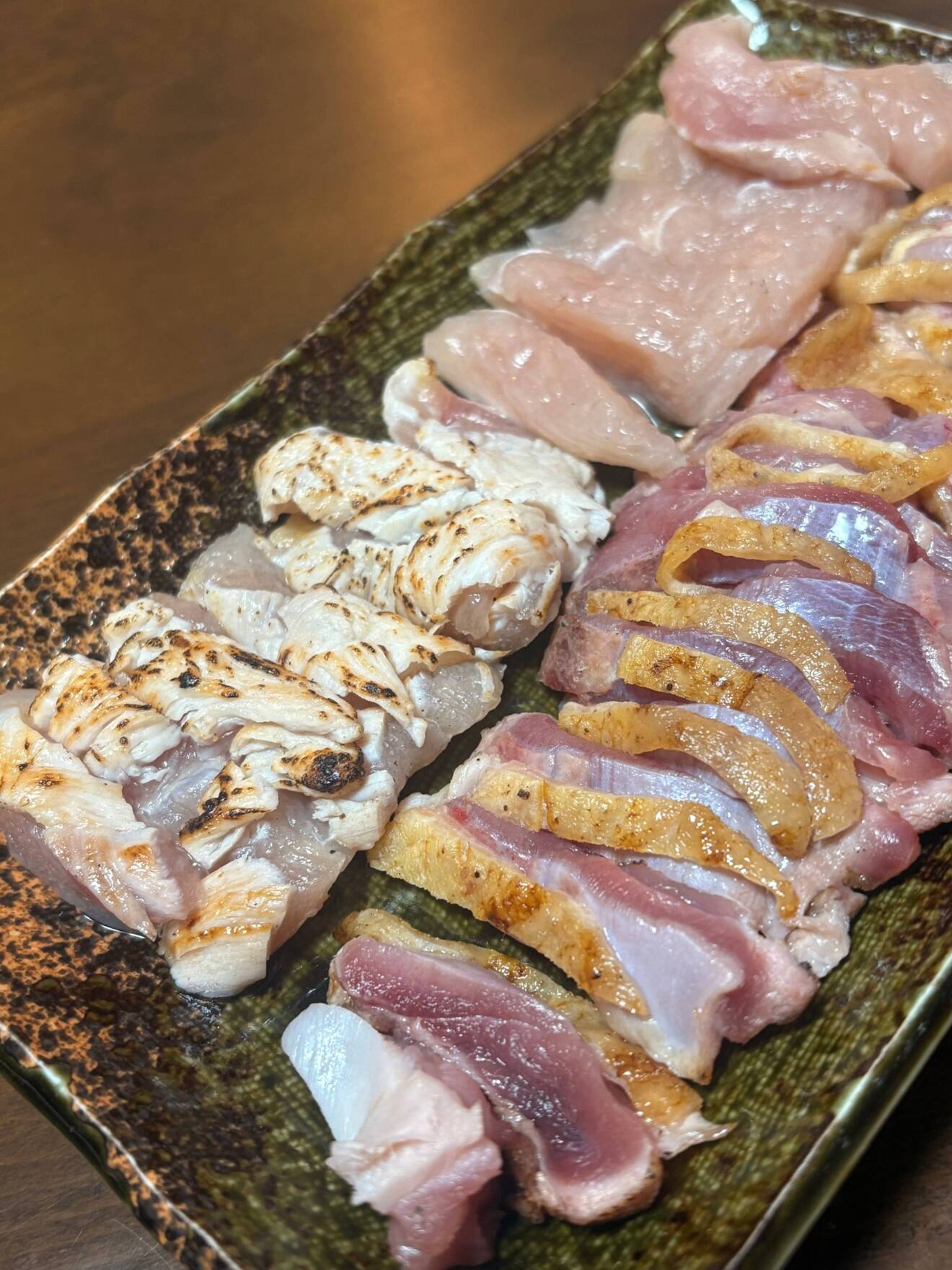 タタキ、もも肉、胸肉 どれも艶々で新鮮、弾力があり噛めば噛むほど旨味が出ます❤️