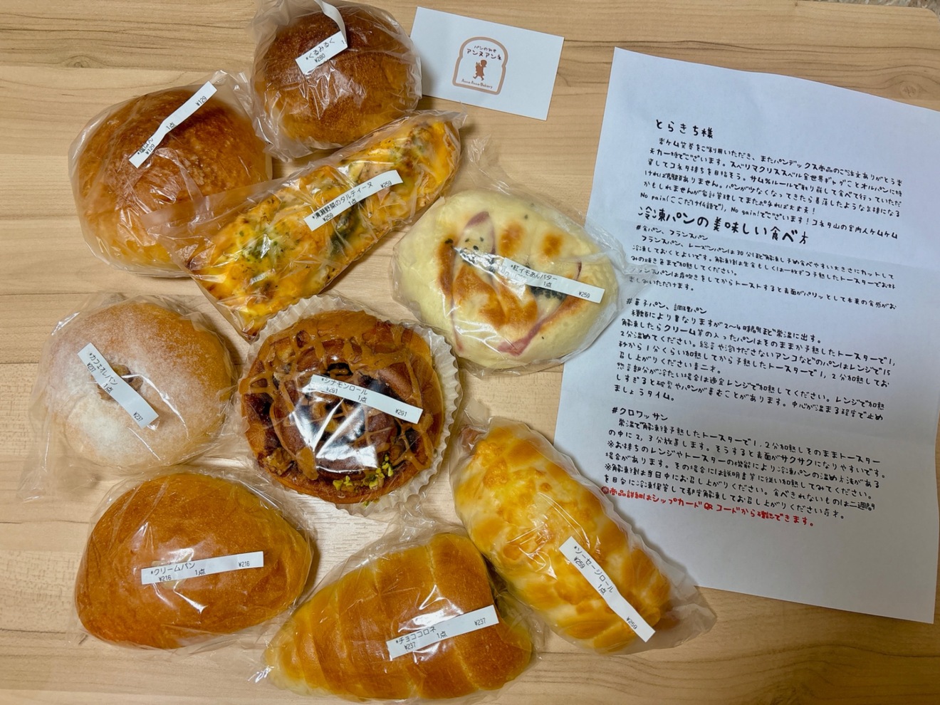 箱を開けた瞬間、手書きのイラスト・メッセージと色々な種類のパンが見えて、幸せな気持ちになりました🥰