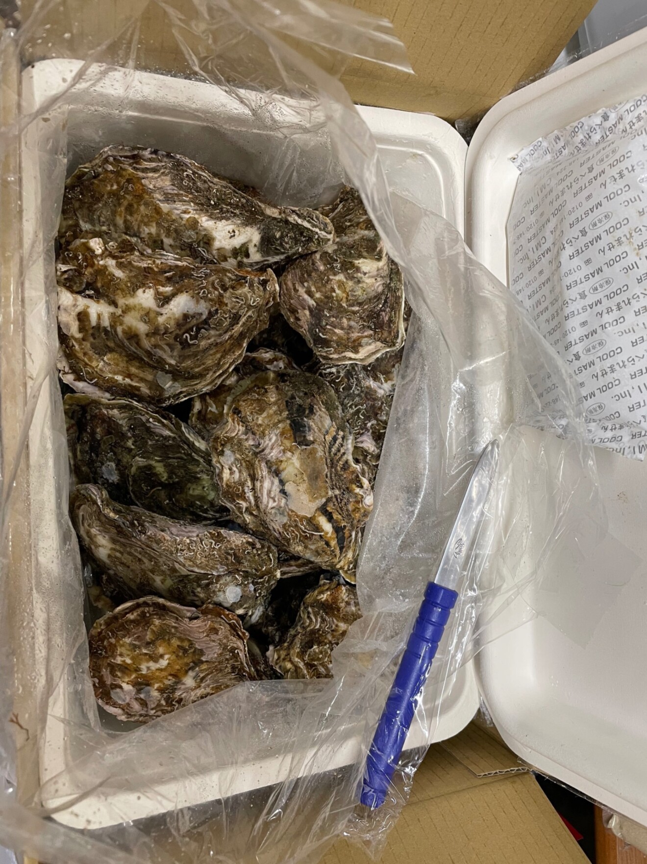 受け取りました!箱にぎっしり詰まった牡蠣たち、一個取り出して戻そうと思ったら蓋が閉まらなくなりました笑