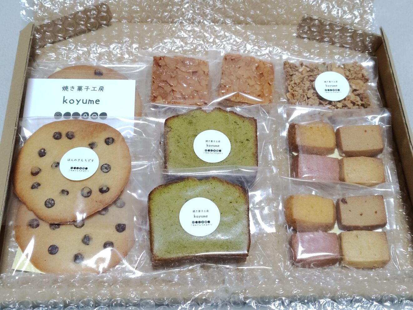 いつも美味しくいただいています。素材同士が調和したやさしい味が大好きです。安定のチョコチップクッキー、毎日食べたくなります。宇治抹茶のパウンドケーキはしっとりしていてお上品な味でした。いつもありがとうございます☺️